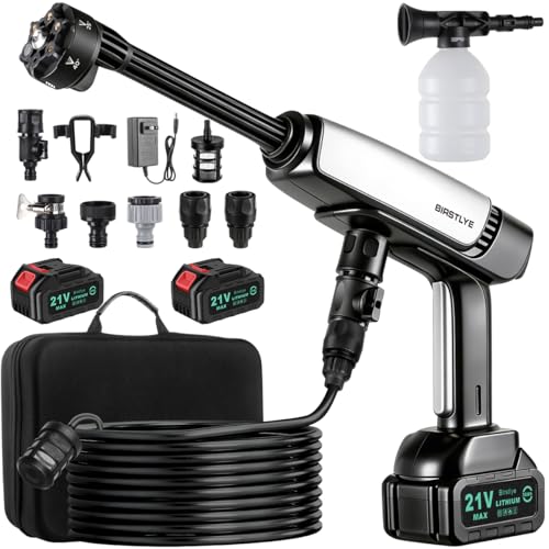 This cordless pressure washer offers a convenient and portable cleaning solution powered by two 21V 4.0AH rechargeable batteries. Designed for versatility, it includes a 6-in-1 adjustable nozzle and a soap container, making it ideal for cleaning cars, bikes, boats, windows, and outdoor surfaces. Its lightweight design allows use anywhere, drawing water from various sources, with safety features like a trigger lock for secure operation.