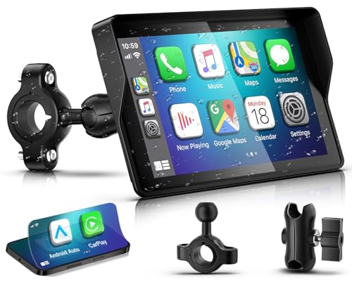 The Carpuride W702 offers a 7-inch waterproof HD touchscreen designed specifically for motorcycles, providing seamless wireless CarPlay and Android Auto connectivity. Equipped with dual Bluetooth, it allows hands-free calls and music streaming through your helmet or headphones. Its durable IP67-rated build ensures reliable performance in all weather conditions, while the easy installation bracket makes it compatible with most motorcycles. Enhance your ride with navigation, voice assistants, and customizable audio options all in one portable device.