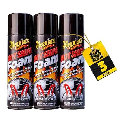 Meguiar's Hot Shine Tire Foam is a convenient aerosol spray that cleans, shines, and protects your tires in one easy step. Its thick foam cuts through dirt and buildup to deliver a deep, rich black shine while providing UV protection and conditioning to keep your tires looking renewed. The water-resistant formula ensures the glossy finish lasts for weeks with minimal effort.